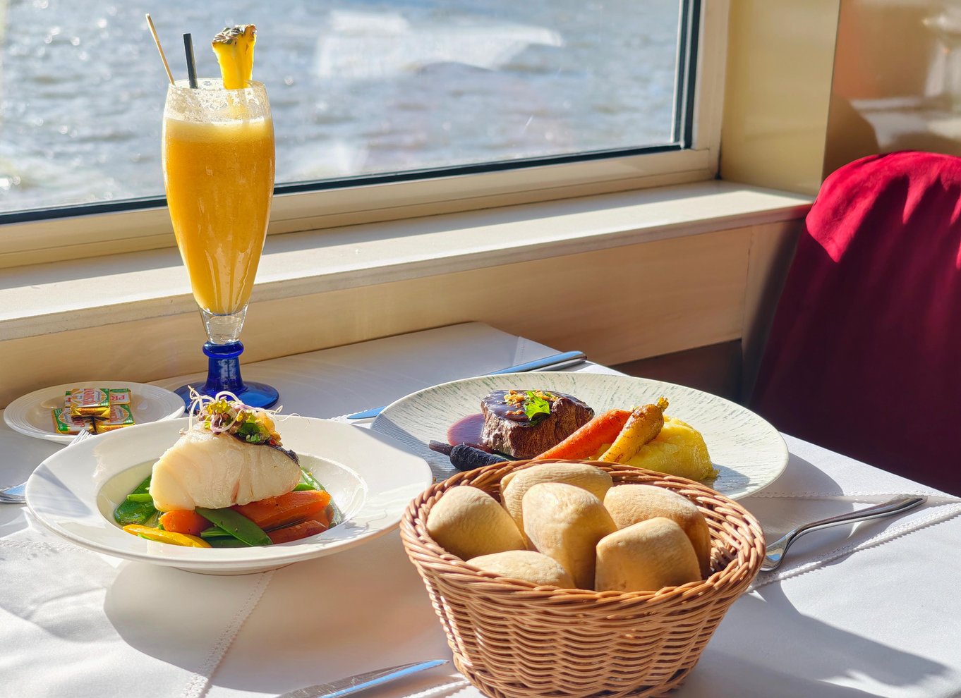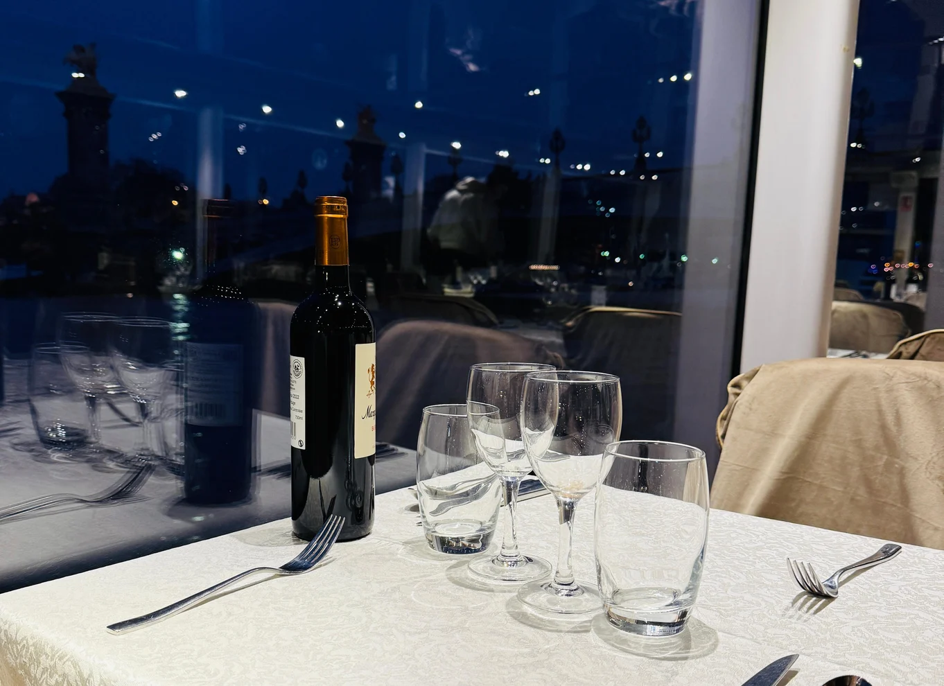 Durante el crucero, los mayordomos te servirán la cena. Deléitate con un delicioso menú degustación que ofrece cocina tradicional parisina de bistró. El momento culminante del viaje es cuando pasas junto a la Torre Eiffel a las 23:00 h. Si lo deseas, también puedes elegir un crucero con cena o almuerzo a primera hora de la noche.