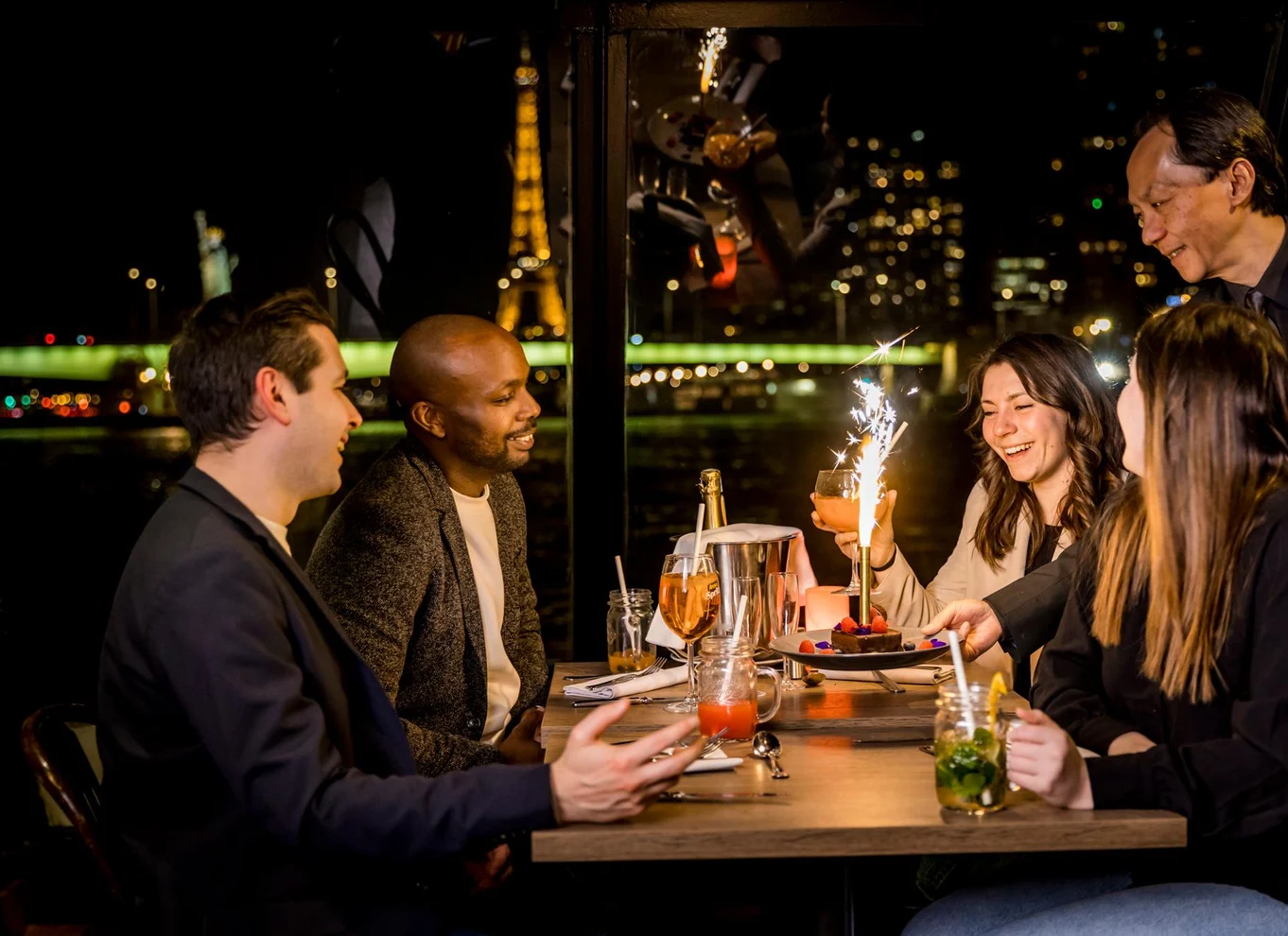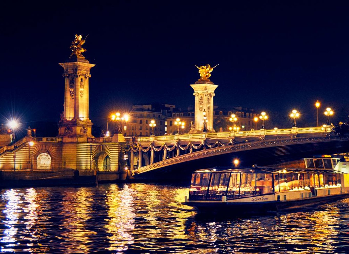 Disfruta de las vistas panorámicas de París iluminado con un paseo en barco con cena por el río Sena, y deléitate con un menú gourmet a base de cocina francesa durante el trayecto.