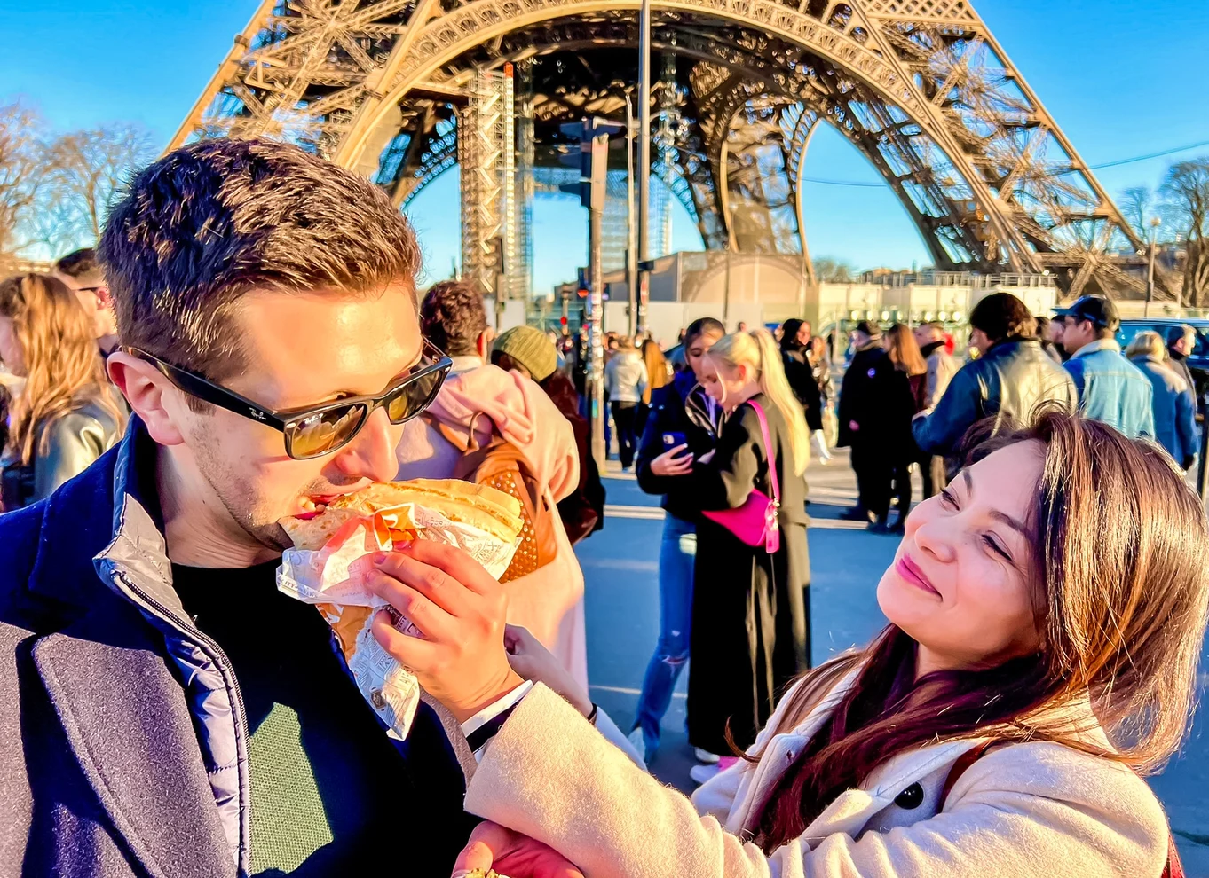 - 1 clătită franțuzească proaspătă, pregătită sub ochii tăi (cu Nutella sau zahăr), cu vedere la Turnul Eiffel din Place du Trocadero